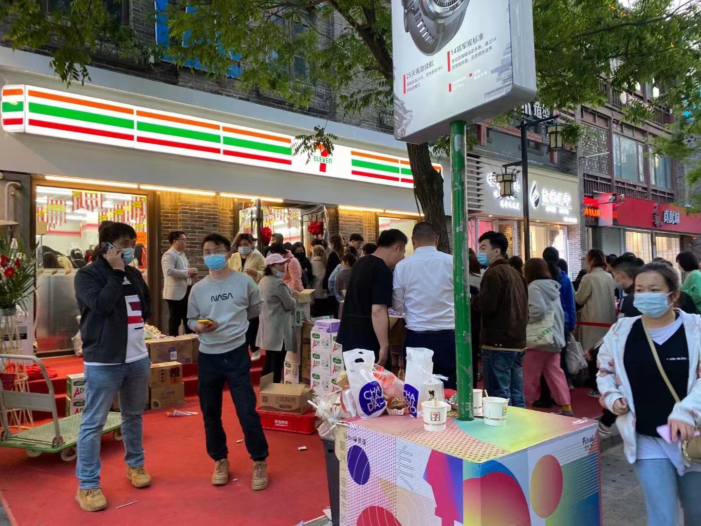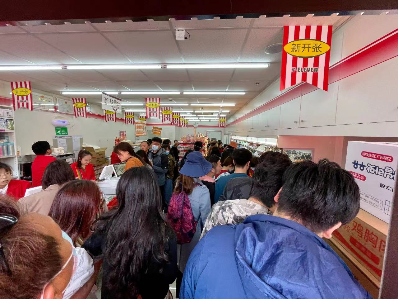 今まで中式コンビニしかない中で、やっと日式コンビニがオープンということで、街はお祭り状態に。外は幟が何メートルにも及び掲げられ、店内は人の山、外も人集りの山。日式コンビニオープンでこんなに祭りになるとは、地方都市あるある。