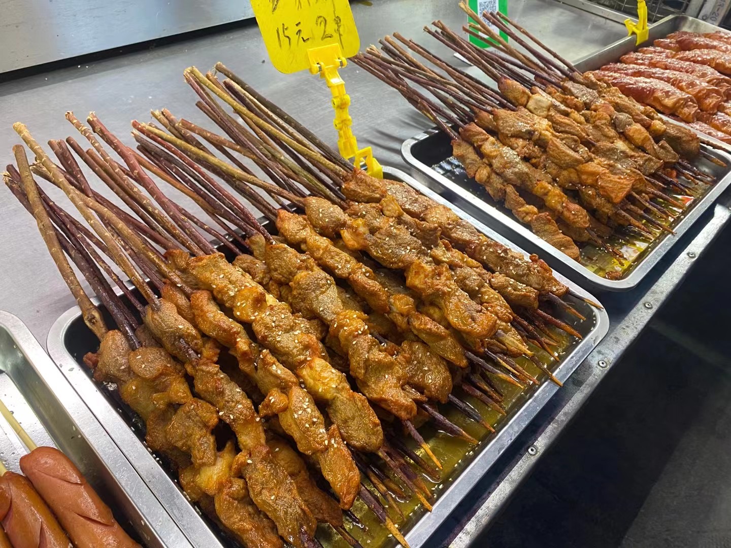 この白いグロテスクな物体は羊のキャンタマちゃんです。これに香辛料などブッかけて炭で焼きます。味は不味くはないですね。淡白な味です。それ以外でも海鮮やら羊肉串やらと。お味はみんな似たり寄ったりの味です。