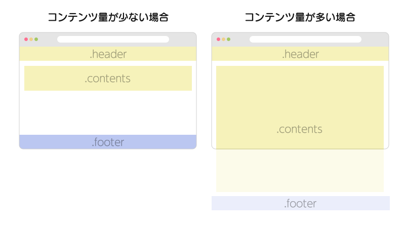 コンテンツ量が少ない場合、フッターはブラウザの下部に固定させ、