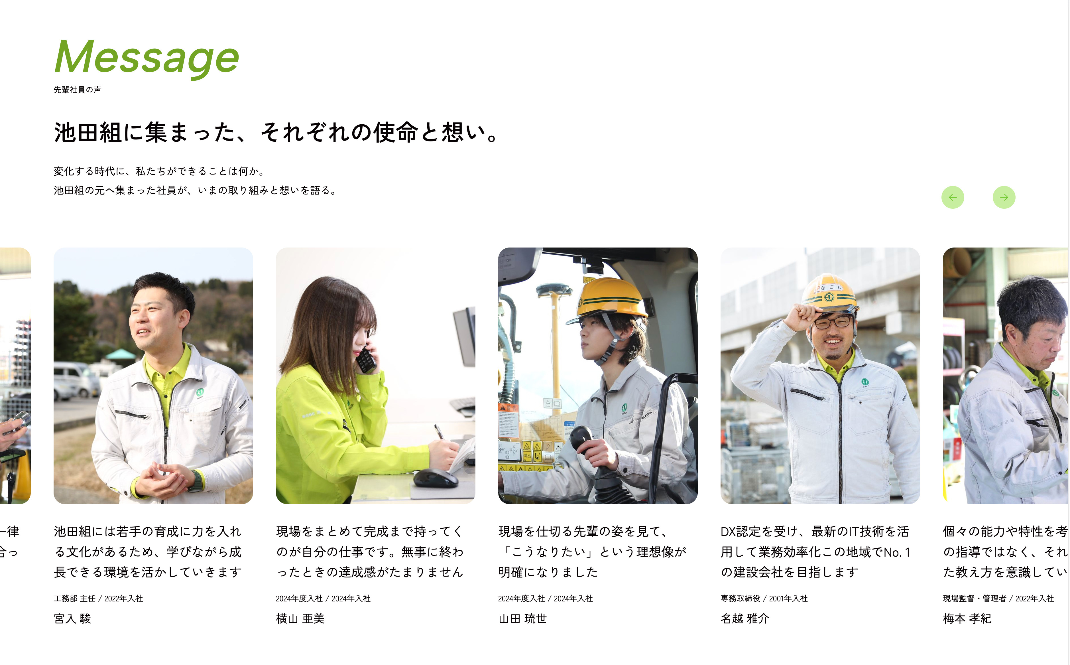 事前にサイトで社風や仕事内容を深く理解した応募者が増えたことで、面接時の相互理解が深まり、採用のミスマッチも軽減。単なる求人媒体ではなく、池田組様の未来を支える「情熱ある人材」を惹きつける、強力なブランディング基盤を確立しました。